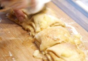 Auf den Teig verstreiche ich mit einem Pinsel die Apfelmasse. Darauf streue ich die Zucker-und-Zimt-Mischung. Ich schneide jetzt mit dem Pizzaschneider ungefähr 5 Streifen quer. Die Streifen werden nun aufeinandergelegt und nochmal längs mit dem Messer in kleine Quadrate geschnitten.