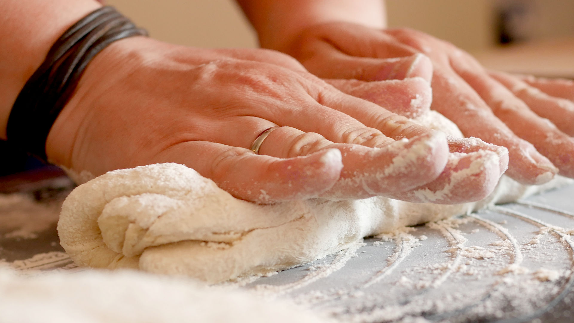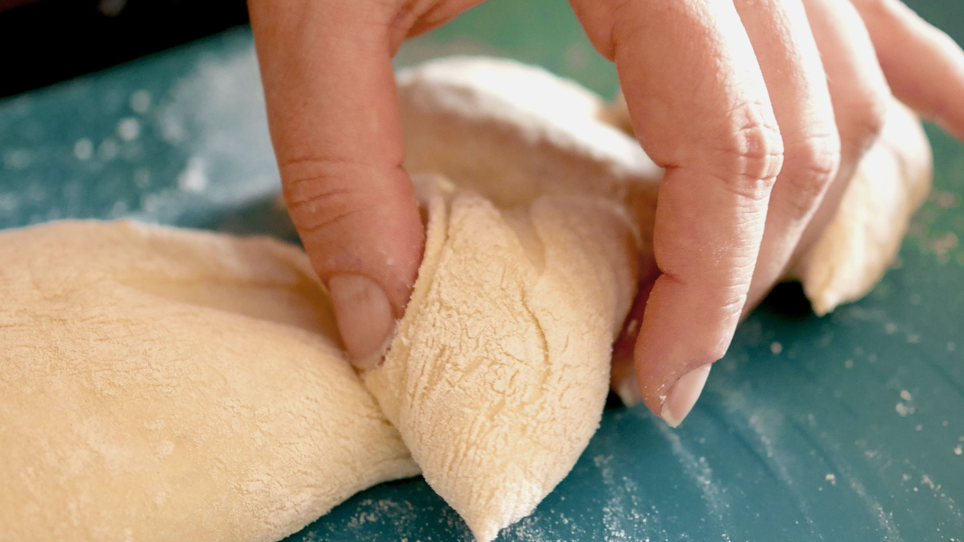 Anschließend gebe ich den Teig auf meine bemehlte Arbeitsplatte und bearbeite ihn nur noch vorsichtig, damit die entstandenen Hefebläschen nicht verschwinden. Ich teile den Teig in zwei Teile und forme jedes davon zu einem Strang. Diesen lege ich auf ein Backblech mit Backpapier. Mit einem Küchenhandtuch abgedeckt darf der Teig noch einmal 20 Minuten ruhen. Diese Ruhezeit reicht perfekt zum Aufheizen des Ofens.