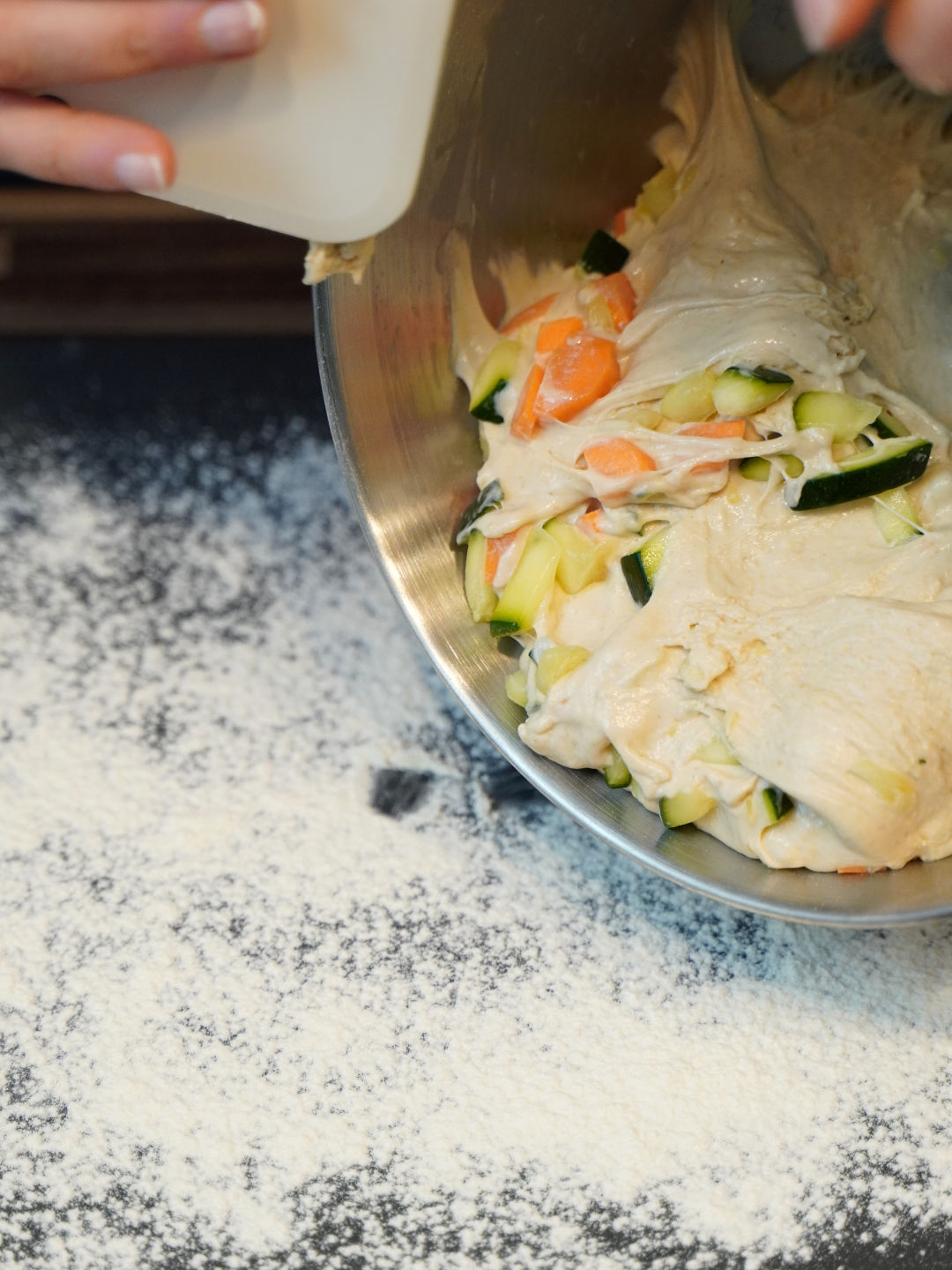 Danach gibst du das kleingeschnittene Gemüse dazu und lässt den Teig ungefähr 5 min langsam kneten. Danach stellst du die Küchenmaschine eine Stufe höher und lässt den Teig weitere 2 Minuten kneten.