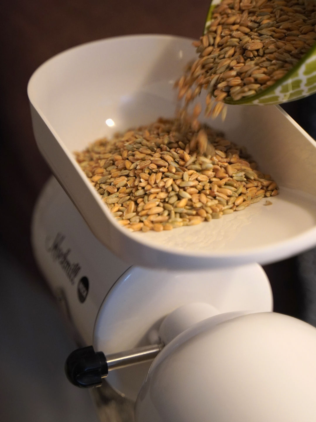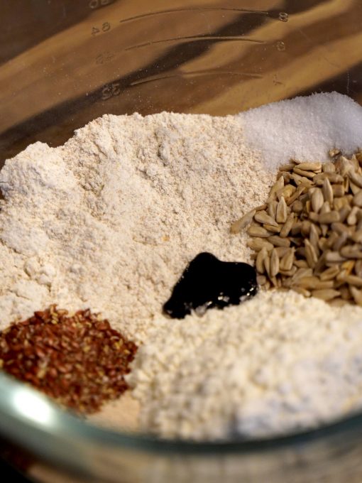 Ich mahle mein Vollkornmehl immer selbst. Dazu habe ich einen Mahlaufsatz für meine Küchenmaschine. Natürlich kannst du auch (und dann geht´s noch schneller :-)) gekauftes Vollkornmehl verwenden.