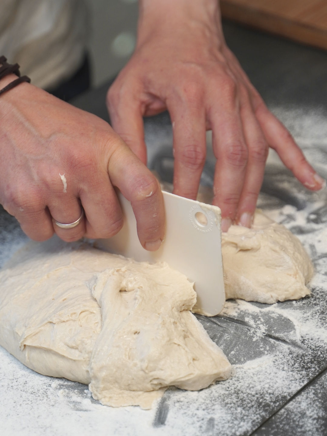 Ich backe gerne zwei kleinere Fougasse, daher teile ich den Teig in zwei Teile. Das geht am besten mit einer Teigkarte. Nun drücke und ziehe ich den Teig direkt auf Backpapier oder einer Backmatte zu einem flachen Viereck. Mit der Teigkarte, einem Pizzaroller oder einem Messer schneide ich das Viereck einmal diagonal innen ein und ziehe den Schnitt ein bisschen auseinander.