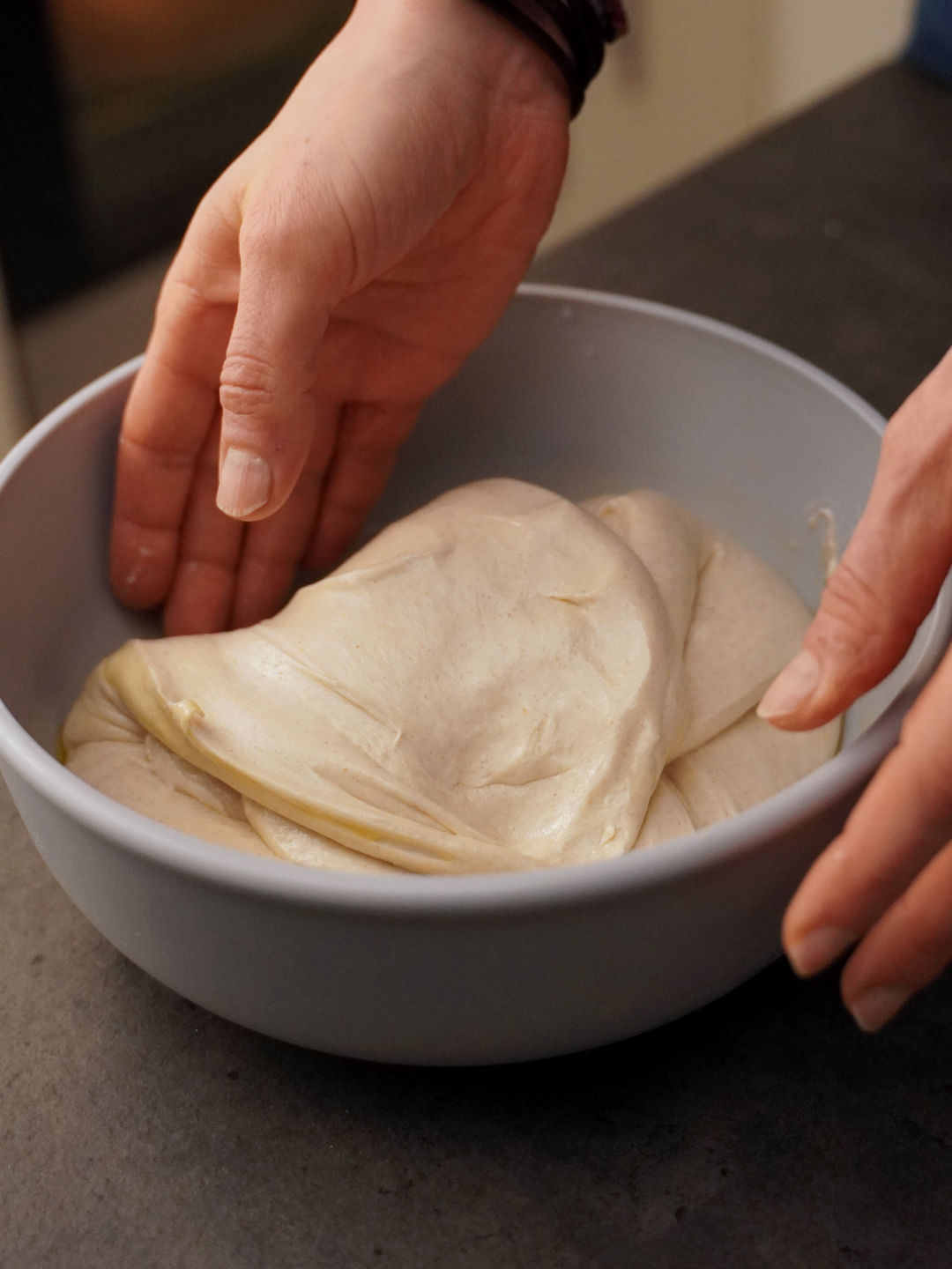 Der Teig muss jetzt ungefähr 4 Stunden gehen. Das kannst du entweder direkt abgedeckt in der Schüssel machen oder du gibst den Teig in eine weitere Schüssel, die du mit ein bisschen Öl eingepinselt hast. Das hat den Vorteil, dass der Teig nicht in der Schüssel kleben bleibt, wenn du ihn dehnst und faltest oder wenn du ihn dann zum Formen aus der Schüssel holst. Wichtig ist in jedem Fall, dass der Teig abgedeckt ist. Das funktioniert auch mit einem Küchenhandtuch.
